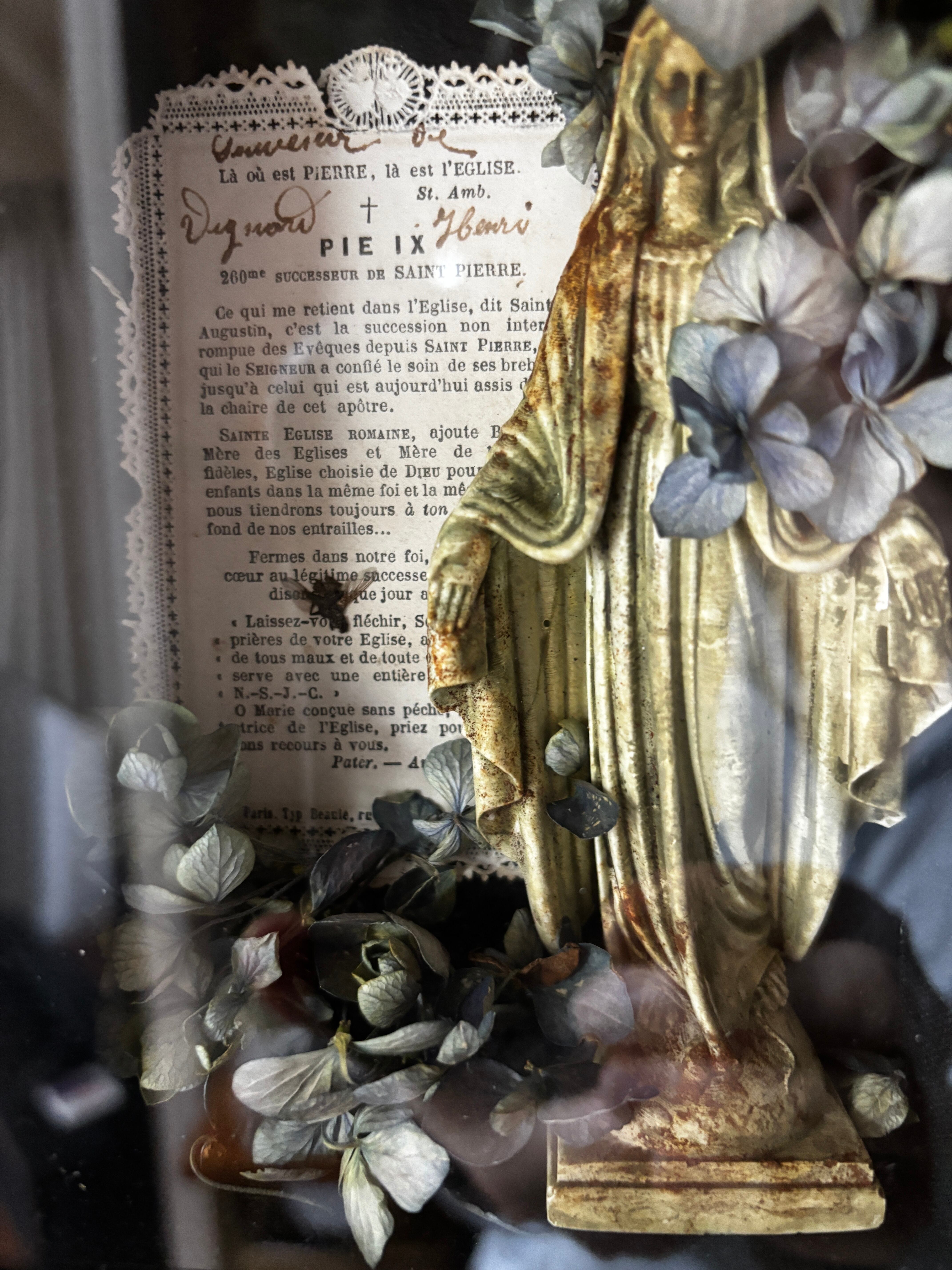 石膏にエイジング加工をしたマリア像に添えたホーリーカードには当時からなのでしょう。